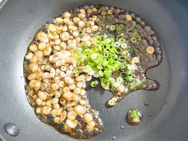 そこに揚げ玉、刻んだ青ネギを加えます。筆者は余っていた『えび入り天かす』を使いました。