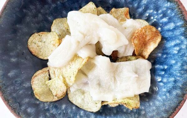 別の皿に『湖池屋プライドポテト 神のり塩』を盛り、その上に餅、チーズの順でのせていきます。