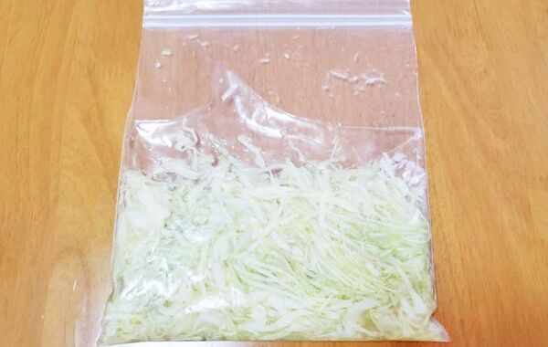 ビニール袋にせん切りキャベツ、ミツカンの『プロが使う味 白だし』(以下、白だし)、水を入れます。