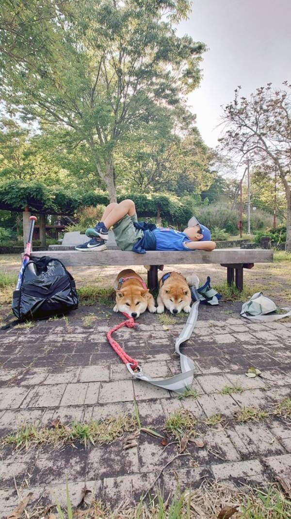 練習を終えた息子さんに、愛犬たちが「お疲れさま」と寄り添っているようにも感じられませんか。