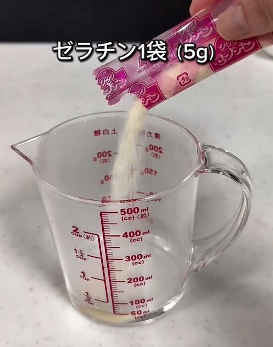 まずは、お湯50ccに、ゼラチン5gを入れてください。