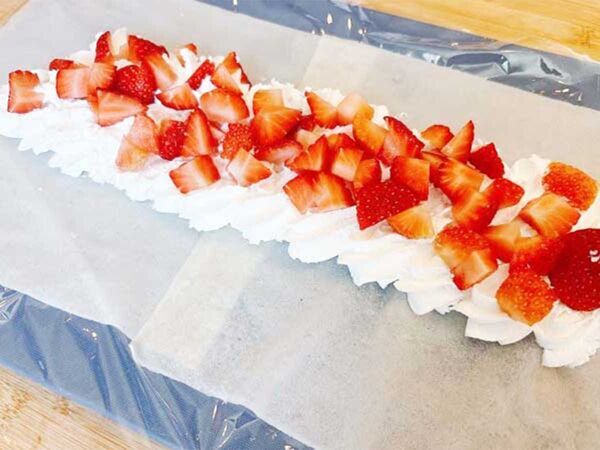 先ほどと同様に、電子レンジで加熱した春巻きの皮を2枚ずらして重ねたら、中央部分にホイップクリームとイチゴをのせていきます。