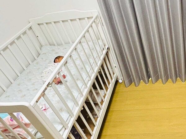 ベビーベッドに寝かされた赤ちゃんが気になり、視線を向けている2匹。