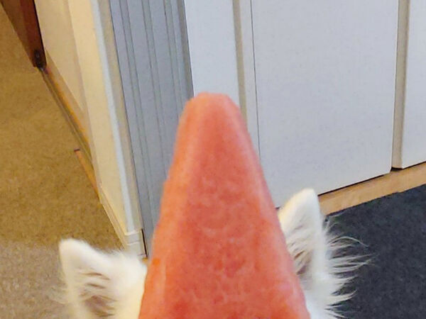 そう、投稿者さんは、スイカを3か所繰り抜いて、愛犬の『顔はめパネル』を作っていたのです!