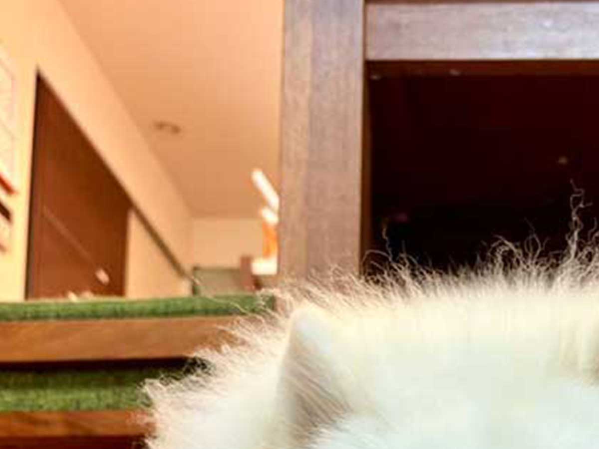 スイカの奥に見える、かわいらしい目と鼻の持ち主は、サモエドの楽ちゃん。