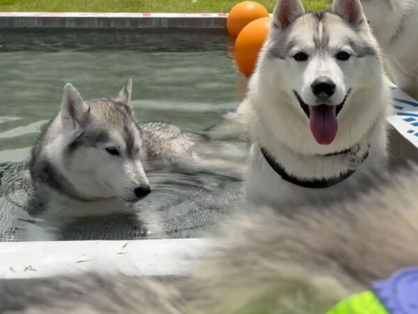 プールにやって来た3匹のハスキー 泳ぐと思いきや…