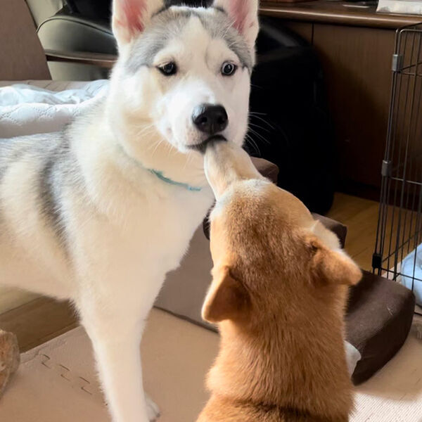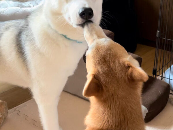 シベリアンハスキーのアシリちゃんが、柴犬のリンちゃんからキスをされて驚くような表情を見せていたのでした…!