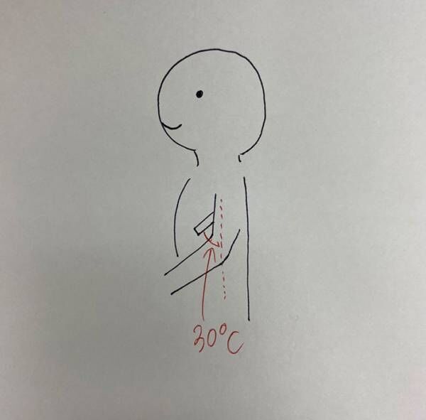 体温を測るときは脇汗をしっかり拭きとってから測定。さらに、ワキに体温計を挟む時は、ワキのくぼみに下から入れるようにして、30度の角度がいいとのことです。