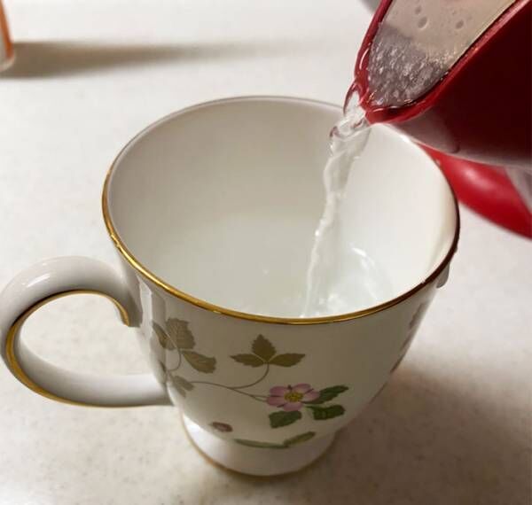 おいしそうなので、田中さんもおすすめする方法で実際に紅茶を作ってみました。まず熱湯をカップに注いで温めた後、いったんお湯を捨てます。