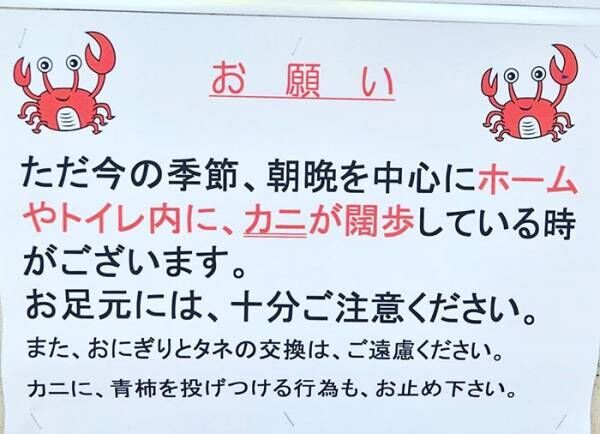 小さなカニたちを駅の利用者が踏んでしまわないよう注意喚起をするため、こういった貼り紙を掲示することにしたのですね。