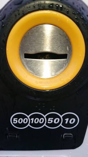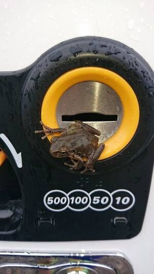 写真をよく見ると、コイン投入口の中に、カエルが侵入しているではありませんか!