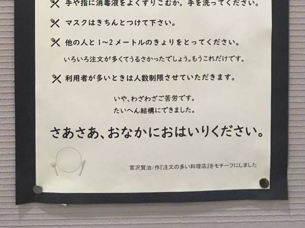 文豪・宮澤賢治の童話『注文の多い料理店』の一節をモチーフに、ユーモラスな表現で来館者に対策を呼び掛けています。