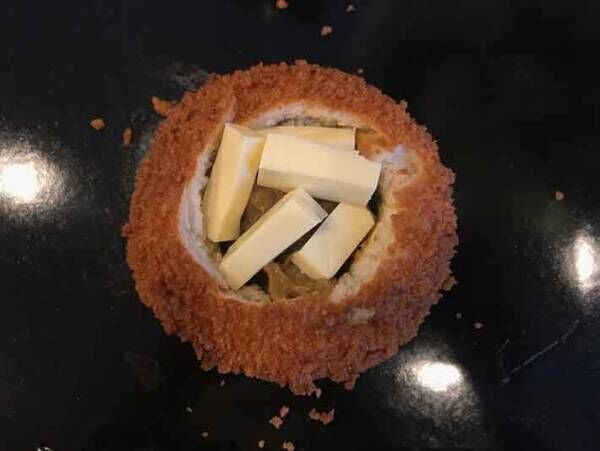 くり抜いた部分にベビーチーズをのせ、トースターで加熱。