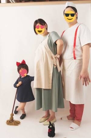 夫は、キキが住むことになる店のパン職人に。妻の千紘さんは、お腹の大きさを活かして、店のおかみにコスプレをしました。