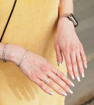 メタリックシルバーのネイルで手元を涼し気に。アクセサリーを控え目にすることで、ネイルの輝きが際立つ。