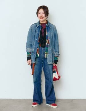 デニムジャケット、ブルゾン、ボトムス/以上3点すべてヴィンテージ、ブラウス/マチュアリー、バッグ/エルエルビーン、リング/インディアンジュエリー