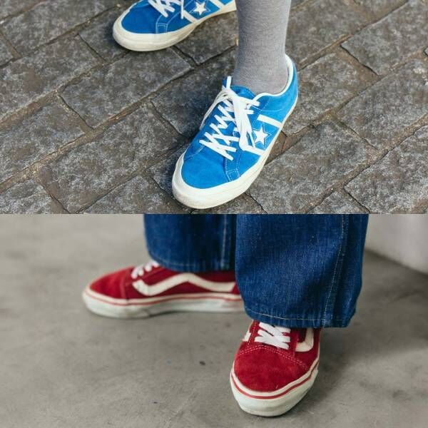 高級感のあるスウェード素材の『ヴァンズ』のスニーカー。ポップな赤色はヴィンテージデニムとの相性ばっちり。シャツやバッグにもポイントで赤を取り入れるとグッド!