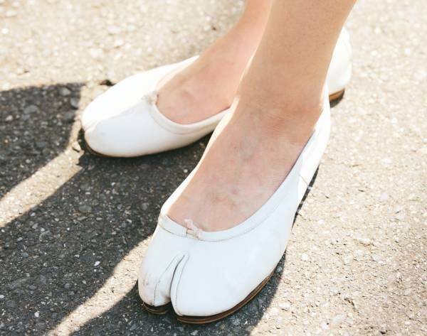 白のボトムスに合わせて同色のシューズをチョイス。適度に肌見せすることで、タートルネックが軽やかな印象に。
