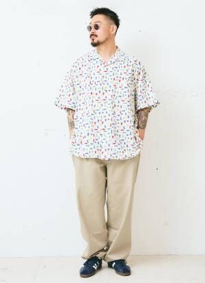ポップな柄シャツをクールに着こなすテクがお見事。サングラスは、ゆるやかな曲線を描くブリッジとラウンドフレームがこなれ見え。