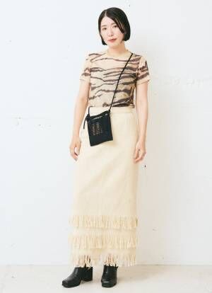 ペンシルスカートにはヒール付きシューズが好相性。小物でブラックを投入することで、グッと引き締まる。