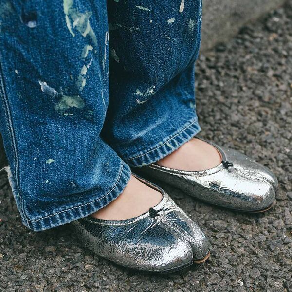 ペイント加工が印象的なのペインターパンツは、ママが働く『atsurae vintage』のもの。シルバーのタビシューズを合わせてモードな足元に。