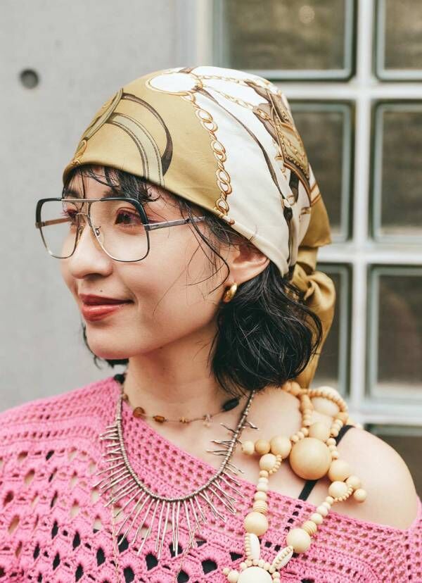 おばあちゃんが手編みしたというピンクのニットは唯一無二のアイテム。スカーフやネックレスはゴールド系にまとめて、エレガントさを演出したのがグッド!