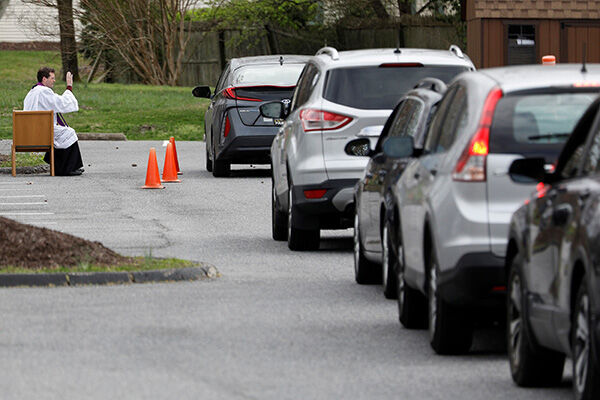 非常事態宣言発令中のメリーランド州では、カトリック教会の神父が感染の危険性が低い屋外で「ドライブスルー告解」を実施。車が列を作っている(写真:ロイター/アフロ)