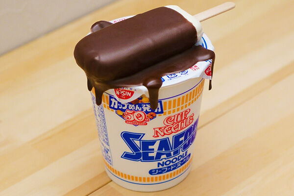 あわせてアップされた写真を見ると、そこにはカップヌードル・シーフード味の姿が。そして、溶けたチョコレートアイスを模したフィギュアが蓋を止めていた。どうやら、カップヌードルの熱気でアイスが溶けた様子を表現しているようだ。