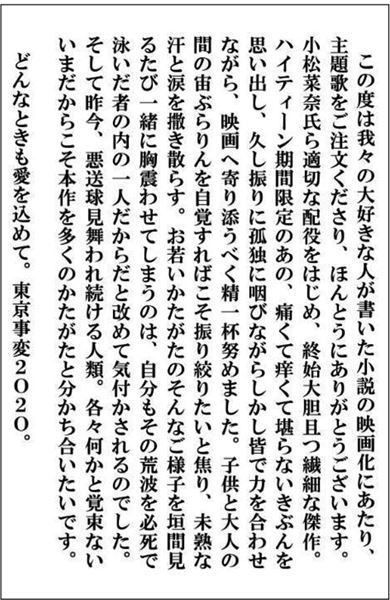 小説を映画にする時、一番大切にするのは読後感です。何度も泣いたし、いっぱい笑った、そして元気をもらったこの家族を描きたいと思った。素晴らしい俳優たちとサクラを演じた犬のチエちゃんとの奇跡的な出逢いで生まれた映画です。試写室ですすり泣く声を聞いたのも初めてですが、何より嬉しかったのは、涙より笑い声が起こったことです。「生」を描くには分母に「死」があり、「哀しみ」を描くには分母に「笑い」が必要です。きっと、この家族との出会いが、今の長いトンネルの先の一筋の光になってくれると信じています。最後に届けられた東京事変の主題歌『青のID』は、 今だからこそ、世界に愛を叫ぶ、新しい喜劇の産声のように聞こえました。