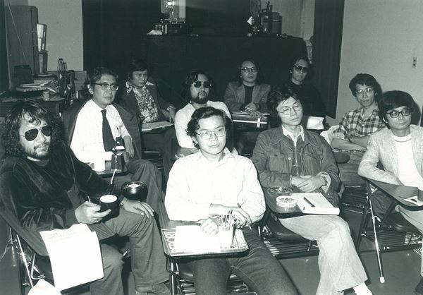 大島渚、かわなかのぶひろ、ほしのあきら、松田政男、松本俊夫ら審査員各氏がそろったPFF審査中の貴重なショット。手前左端サングラスが大林監督。写真提供:PFF
