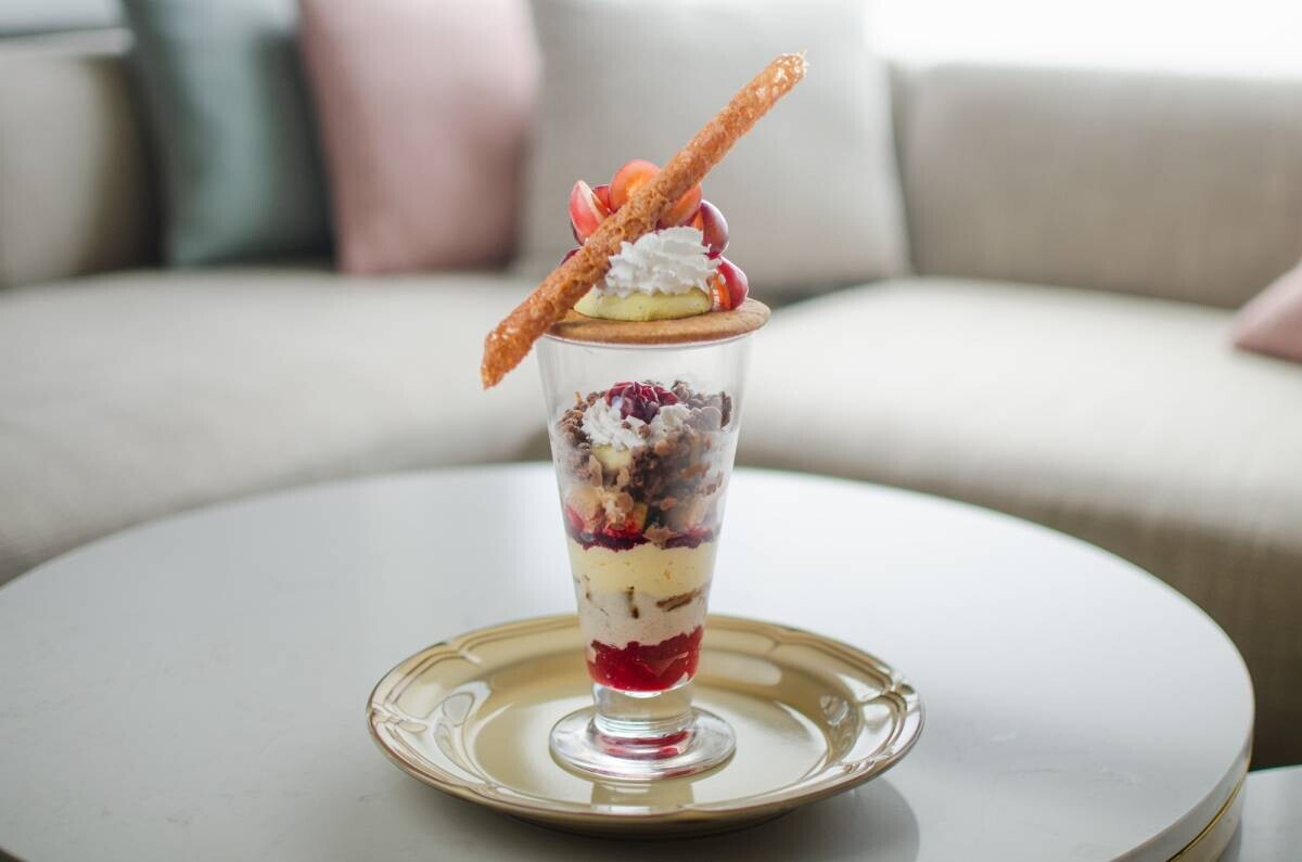グラスの上には宝石のように輝くさくらんぼと、濃厚なコクがたまらないピスタチオのパルフェを飾り、サクッとしたココナッツチュイルを添えました。スプーンを進めると、ひんやりとしたチョコレートのグラニテ、クリーミーなバニラアイス、香ばしいシュトロイゼルが次々と現れ、一口ごとに新しい発見をもたらします。下層には爽やかなはちみつヨーグルトソースとさくらんぼのジュレを忍ばせ、最後までさっぱりと上品にお楽しみいただける一杯です。