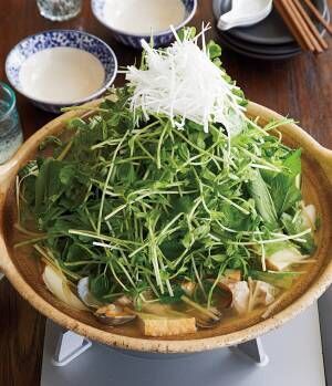 山のように盛った野菜にうまみのある塩味のつゆがからんでぺろりといける「豆苗マウンテン鍋」