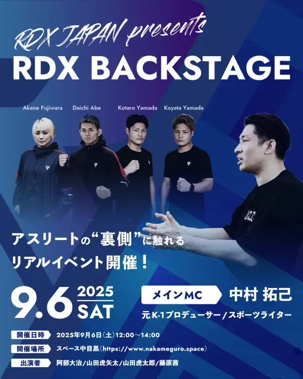 スポーツ全般、生活雑貨を中心に国内総合代理店を務める株式会社Cycle(代表:飯田 航、本社:東京都豊島区、以下Cycle)が代理店を務める英国発のボクシング・フィットネスブランド「RDX® SPORTS」は、2025年9月6日(土)に、初開催となるトップアスリートと直接ふれあえるリアルイベント『RDX BACKSTAGE』のスペシャルMCとして、元K-1プロデューサーのスポーツライター 中村拓己さんの出演決定をお知らせいたします。参加チケットも絶賛販売中で、無くなり次第終了となります。