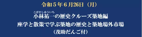 両国リバーセンター受付集合(8時50分)⇒パールホテル両国2階会議室にて講義(9時~10時)⇒水上バス乗船・両国リバーセンター発着場発(10時15分)~隅田川下る~大川端付近Uターン~隅田川上る~明石町聖路加ガーデン前着・水上バス下船(11時30分)⇒講師の解説で築地歴史散策(11時30分~13時)=解散・各自築地場外市場で自由散策