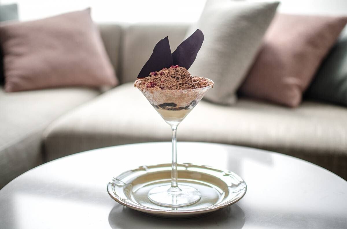 みずみずしいスイカの果肉と特製ソースを贅沢にトッピング。その下には、ふんわりとしたスイカ氷、塩味を効かせたサクサクの「ムラング・スイス・サレ」、そしてなめらかな杏仁豆腐を重ねました。