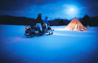 同ツアーは、月明かりに照らされた広大な雪原をスノーモービルで疾走し、途中、テントや焚き火が準備されたお月見スペースで、ホットワイン「ヴァンショー」を頂きながら温まりながら月を眺めます。