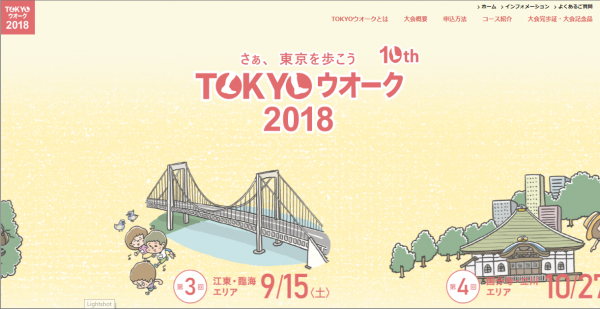 「TOKYOウォーク2018」第2回以降は7月、9月、10月、12月に開催。完歩した大会数に応じて特製ピンバッジがプレゼントされます。