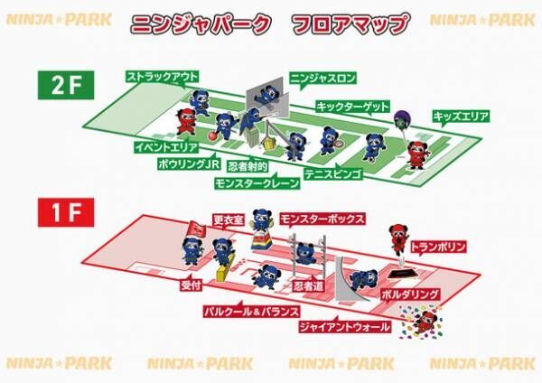 1階には、本格アスレチックコース「忍者道(NINJA-DO)」をはじめ、「トランポリンエリア」、東京五輪でも使用されたようなコースを備える「ボルダリングエリア」、お馴染みの「モンスターボックス」や本格的な大会を開催できる規模の「パルクールエリア」などニンジャ☆パークの特徴的なエリアを設置。2階には、「ストラックアウト」「キックターゲット」などのお馴染みの競技や、子供から大人まで楽しめる全長42mのニンジャスロン(ふわふわアスレチックコース)、ニンジャ☆パークオリジナルの「モンスタークレーン(怪力クレーン)」や「テニスビンゴ」などの新競技が新たに誕生。