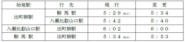 今回の変更は、昨年7月8日に発生した土砂災害により長期間運休しておりました市原駅~鞍馬駅間の運転再開に合わせて実施するものですが、昨今の新型コロナウイルス感染症の感染拡大に伴う、お客さまのご利用状況も考慮し、運行本数及び初発列車、最終列車の見直しを行うほか、9月25日(土)に実施される京阪電車のダイヤ変更に合わせ、「平日ダイヤ」における朝ラッシュ時間帯と夕ラッシュ時間帯以降の出町柳駅での接続を調整した内容としています。