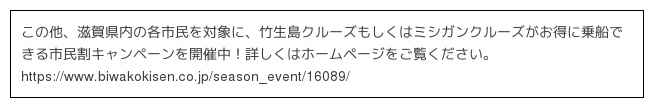 身近な観光スポットが注目されるなか、びわ湖クルーズで心身のリフレッシュを図っていただくとともに、滋賀が誇るパワースポット「竹生島」をご満喫いただく機会となれば幸いです。キャンペーン詳細は次のとおりです。