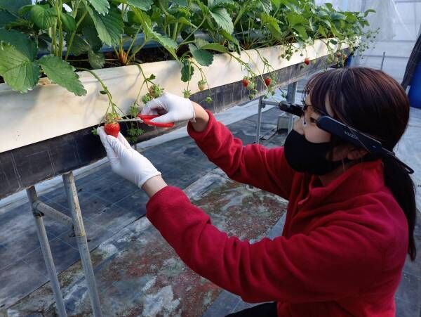 農園スタッフが装着するスマートグラスからの映像でリアルな目線でのいちご狩りが疑似体験でき、摘み取ったいちごを含む新鮮な12粒のいちごを翌日に指定の場所へお届けします。