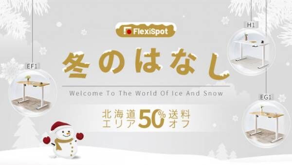 「北海道の皆さん、冬になっても、心配しないで、今回、FlexiSpotは特別キャンペーンがあります。北海道エリアまでの送料は全て50%OFFになる。疲れる時、FlexiSpotもそばにいます。」