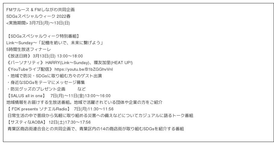 『SDGsスペシャルウィーク 2022春』では、最終日の3月13日(日)に『SDGsスペシャルウィーク特別番組Link~Sunday~「記憶を紡いで、未来に繋げよう」5時間生放送フィナーレ』のほか、レギュラー番組『SALUS all in one』、『ソナエルRadio』、『サスティなAOBA』など各番組内で1週間を通して、防災およびSDGsに関連したテーマで特集をお届けします。