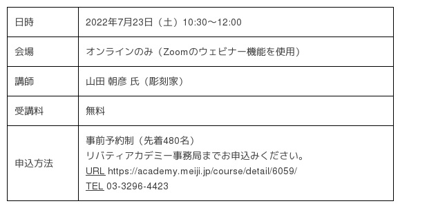 明治大学の生涯学習機関「明治大学リバティアカデミー」は、7月23日(土)に、2022年度春期公開講座「身近にある彫刻たち~東京近郊の彫刻をめぐってみよう~」をオンラインで開催いたします。事前予約制で、参加費は無料です。