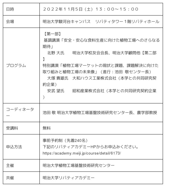 明治大学植物工場基盤技術研究センターが10周年記念事業 公開講座「食料問題に対応する新しい野菜生産の形-植物工場の現状と未来-」を11月5日(土)に駿河台キャンパスで開催