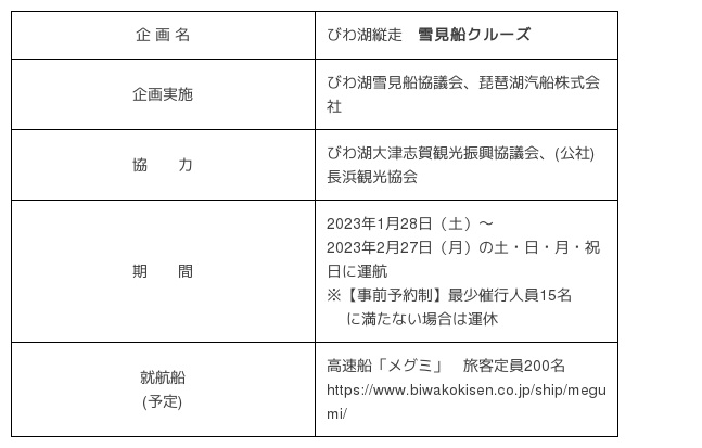 琵琶湖汽船株式会社(本社:滋賀県大津市浜大津、社長:川添 智史)とびわ湖雪見船協議会(会長:佐藤 祐子)は、冬季限定の企画クルーズ「雪見船クルーズ」を2023年1月28日(土)より運航開始します。