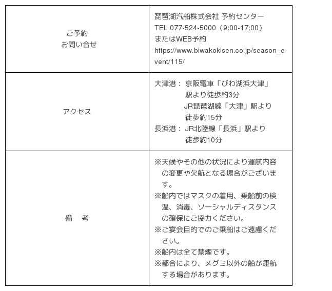 そして復路では、長浜港を14時に出港し、16時50分頃に大津港へ。往路・復路ともに事前予約がある場合には、におの浜観光港やおごと温泉港へも寄港します。