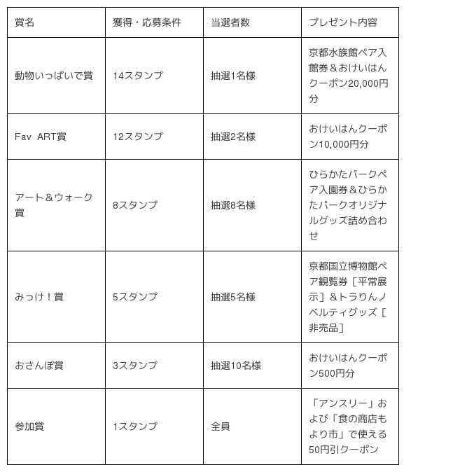 ※「動物いっぱいで賞」の応募には動物スポットの全てのスタンプが必要です。※「Fav ART賞」の応募にはグルメ2店舗、「アート&ウォーク賞」はグルメ1店舗のスタンプが必要です。