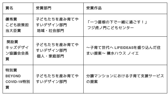 キッズデザイン賞受賞作品258点の中から、優秀作品へノミネートされた37作品が最優秀賞、優秀賞、奨励賞、特別賞として選出され、当社は『「一つ屋根の下で一緒に過ごす!」フジ虎ノ門こどもセンター』がこども政策担当大臣賞に、『~子育て世代へ LIFE IDEASを盛り込んだ住まい提案~ 積水ハウス ノイエ』がキッズデザイン協議会会長賞に、そして『分譲マンションにおける子育て支援サービスの提案』がBEYOND COVID-19特別賞に選出されました。