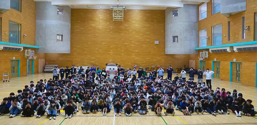また、本郷専務理事は贈呈式の挨拶において、児童養護施設の現状について簡単な説明を行い、オレンジの羽根募金活動の重要性を強調しました。日本児童養護施設財団の公式マスコットキャラクター「もっち~」の着ぐるみも壇上に登場し、会場は児童の歓声に包まれました。